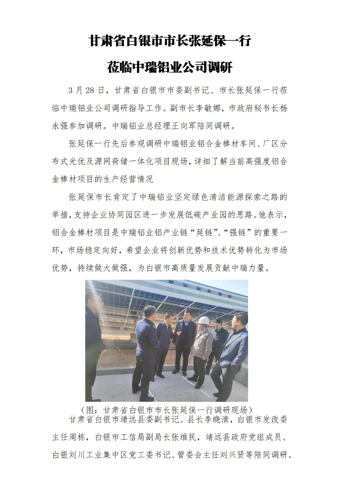 甘肃省白银市市长张延保一行 莅临中瑞铝业公司调研