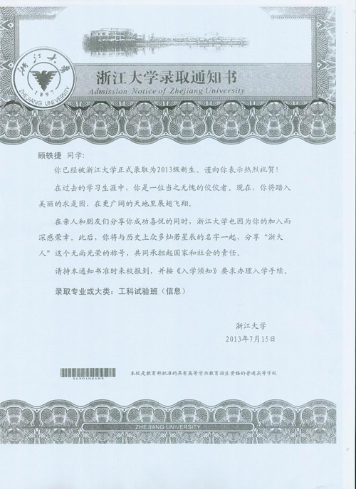 8年来,顾同学在锦江集团的爱心资助和其自身的拼搏努力下,不负众望,今年以总分698的好成绩被浙江大学工科试验班录取,成为浙江大学2013届一名新生。
